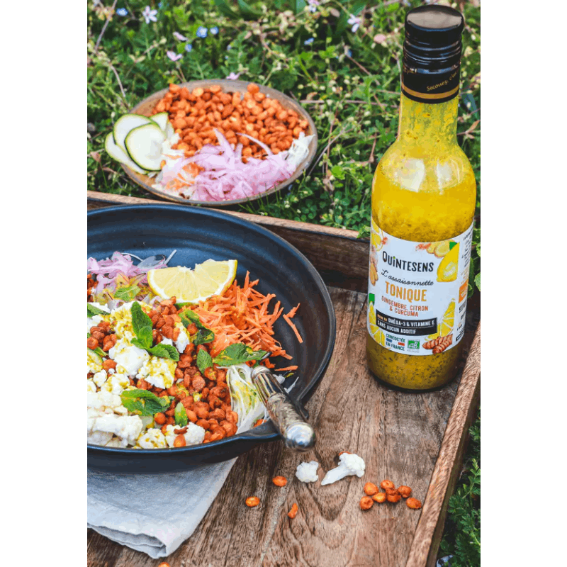 Faites l'expérience d'une vinaigrette tonique, pleine de fraîcheur et de bienfaits, avec notre Vinaigrette Tonique au Citron, Gingembre et Curcuma. Laissez-vous séduire par la vivacité de cette création unique, pour des repas savoureux et équilibrés.