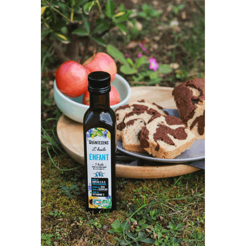 Les besoins nutritionnels et lipidiques d'un enfant diffèrent de ceux d'un adulte. Les lipides jouent un rôle essentiel dans le développement des membranes cellulaires en pleine croissance. La formule de l'huile pour enfants Quintesens, élaborée par des nutritionnistes, combine judicieusement cinq huiles biologiques aux propriétés complémentaires, ajustées dans des proportions adaptées à la période de croissance de l'enfant.